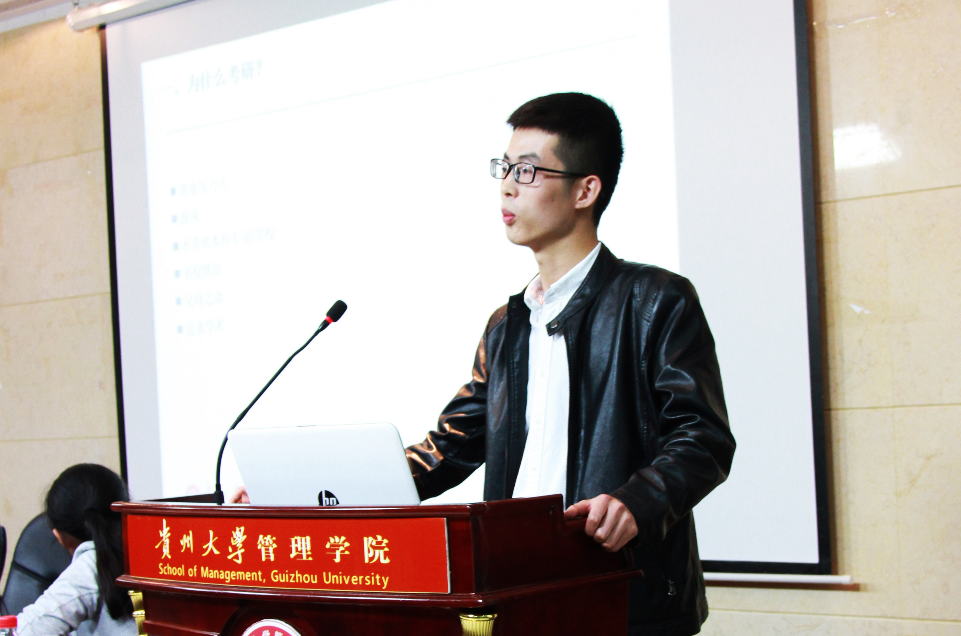 首先由财管131郭心雨同学分享经历,她以优秀的成绩保送电子科技大学硕博连读。她从自己大一一路走来的心路历程中,告诫学弟学妹们,自己决定好的路就坚定地走下去,不要举棋不定,同时也要学会辩证地去思考,不要盲目跟风,多读书,参加课余活动,丰富自己的世界,提升自己。人资131的高全义同学则从考研的角度来诉说自己的求学历程,他是一个考研路上磨练出来的是一个铁骨铮铮的男子汉,他给学弟学妹们的建议是既然认定了要走的路,就要持之以恒,并且结交一个志同道合的朋友;