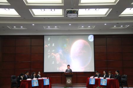 2016年5月26日星期四晚上7:00行政楼一号报告厅,贵州大学第十二届辩论赛总决赛在这里举行。今晚将在这里进行季军之争和冠亚军之争。担任此次比赛的评委分别有贵州大学哲学与社会发展学院院长庄勇,贵州大学保卫处处长叶明,贵州大学法学院副教授法学博士陈松。管理学院接力辅导员李婷婷也到场观看此次比赛。