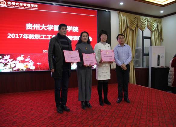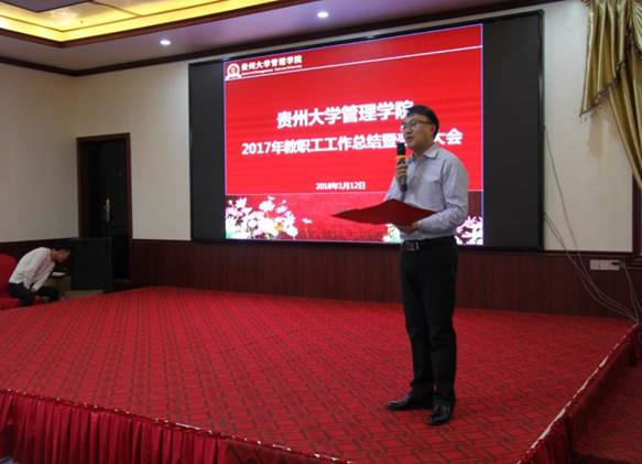 在主持人向大会介绍参会人员之后,李烨院长代表学院党政领导班子向大会做题为《学院2017年工作总结暨2018年工作要点》的报告。李院长表示2017年贵州大学各项事业发展取得新的突破与成就,特别是双一流高校建设和部省共建高校建设,为贵州大学赢得了极大的社会声誉,党的十九大的胜利召开,为贵州大学的发展提供了更为广阔的平台和机遇。学校各项事业的节节高升与全面开花,为管理学院的发展提供了更高水平的平台、更加难得的机遇。在新的机遇和挑战面前,管理学院上下,心往一处想,劲往一处使,2017年学院各项事业取得长足发展,在学校2017年度加快发展目标绩效考核中取得4A1B等次、年度基层党建工作考核中取得优秀等次,此外学院2017年重大成就有三项,分别为:一是农林经济管理、管理科学与工程一级学科进入国内一流学科建设行列,并成功申报农林经济管理、管理科学与工程一级学科博士点;二是成功申报贵州大学波罗的海区域研究中心(教育部国别与区域研究中心),并举行贵州大学波罗的海区域研究中心揭牌仪式暨一带一路跨国知识青年创新创业高峰论坛;三是成立贵州大学校友会管理学院分会,并成功举办学院校友分会成立大会暨首届校友企业家创新创业论坛。