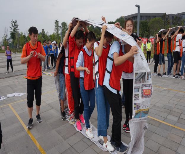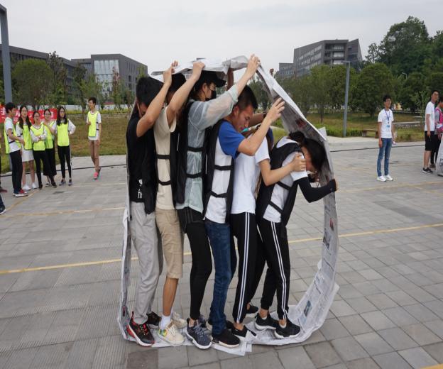 全队利用事先准备好的报纸和胶带,制作一个可以容纳全体团队成员的履带式大圆环,滚过规定的20米路程。