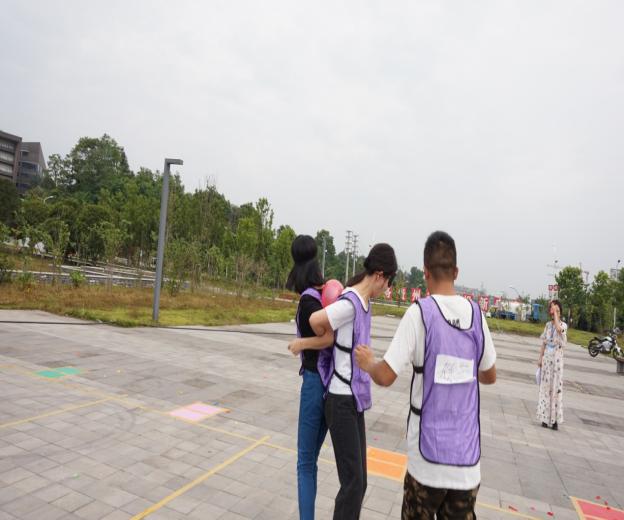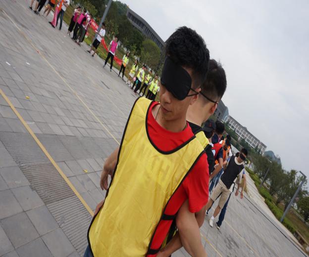 第一、二组队员需要戴上眼罩,从第一组将气球从起点线以背夹运至中界线传给第二组,第二组再接力把气球运至终点线,第三组踩破气球为一个回合。一共5个回合,共需运输5个气球。