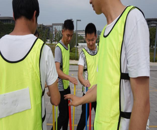 团队成员围成圆圈站立,左手放在背后,右手手掌置于杆顶端,喊“换”同时换杆并保证杆不倒下,连续累计换3圈,用时最少的团队获胜。