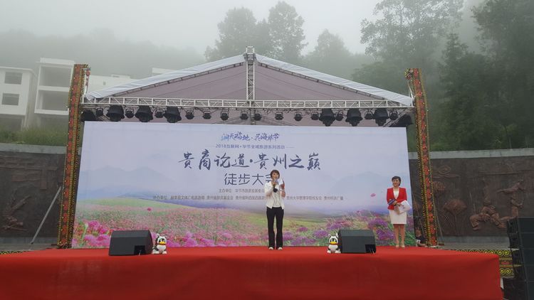 ↑“贵商论道·贵州之巅”徒步大会论道环节,由贵州知名主持人“大方姐”申炜主持,贵大管理学院副院长宋山梅,独立经济学者、知名战略咨询师龙河闻,毕节市旅发委副主任施正军,贵州卫视《论道》栏目执行总监吴睿迪轮流执筒,围绕毕节旅游如何发展,精彩论道……