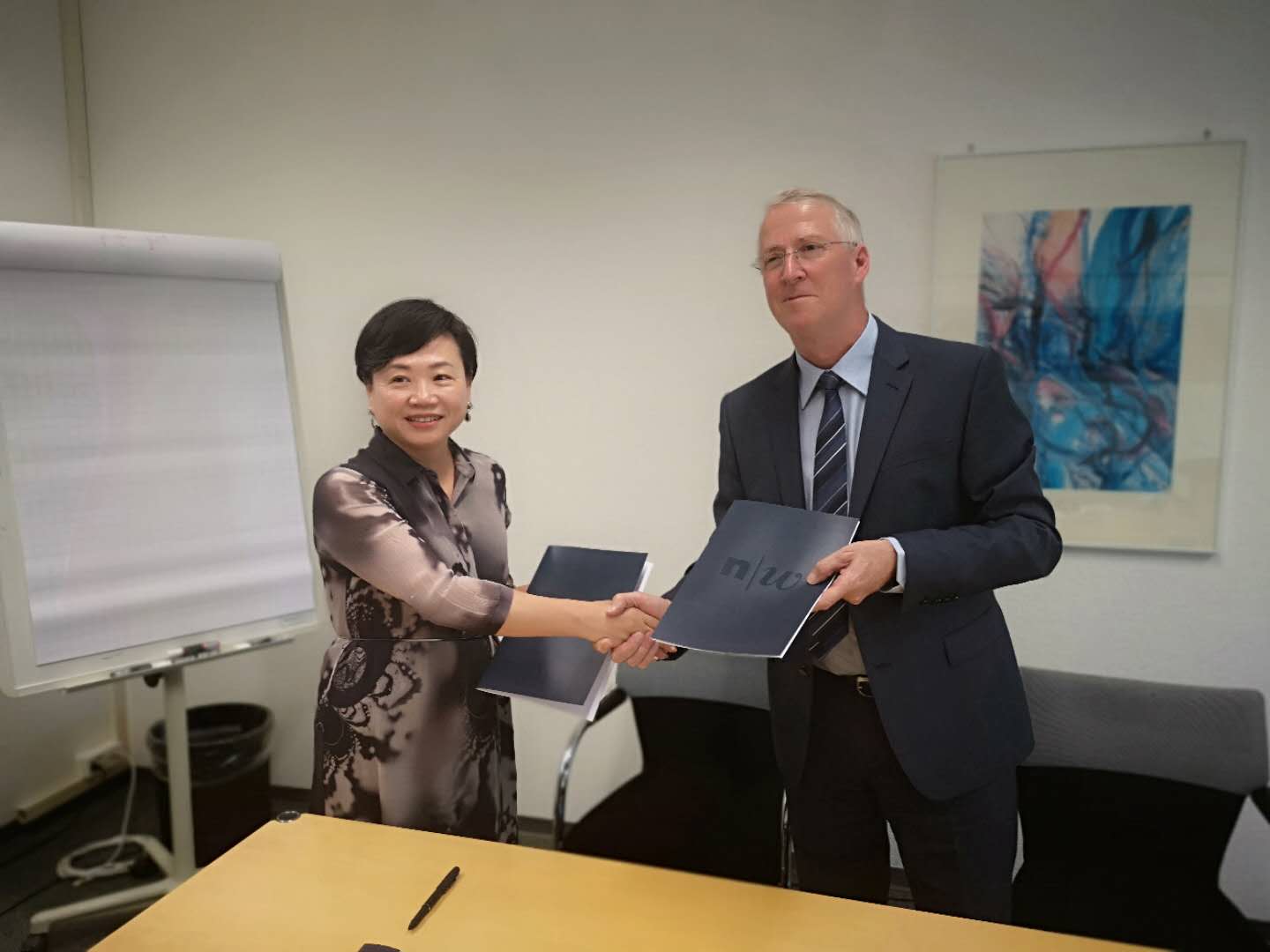 9月20-21日,访问团到瑞士西北应用科学与艺术大学(FHNW)进行了2天的访问交流,瑞士西北应用科学与艺术大学商学院院长Ruedi Nutzi教授、商学院教学部主任Markus Freiburghaus教授、 中国项目部主任Yufan Jiang博士接见了我院访问团,双方就本科教学、MBA/EMBA、EDP学生联合培养、教师交流互访等做了详细的沟通,并签署了合作备忘录。