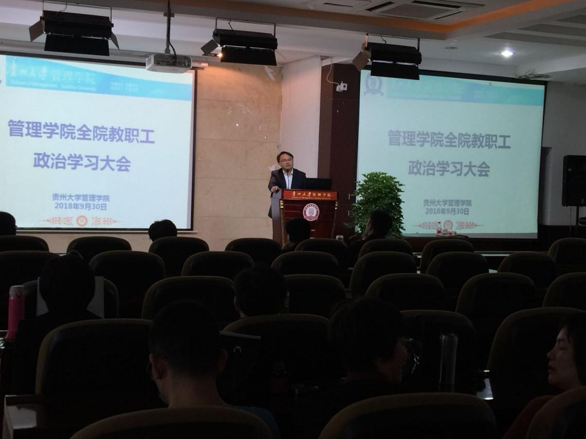 根据学校党委统一安排部署,管理学院于2018年9月30日中午13:00在学院三楼报告厅组织开展全院职工政治学习大会,学院领导及教职工参加了会议,会议由学院院长李烨主持。