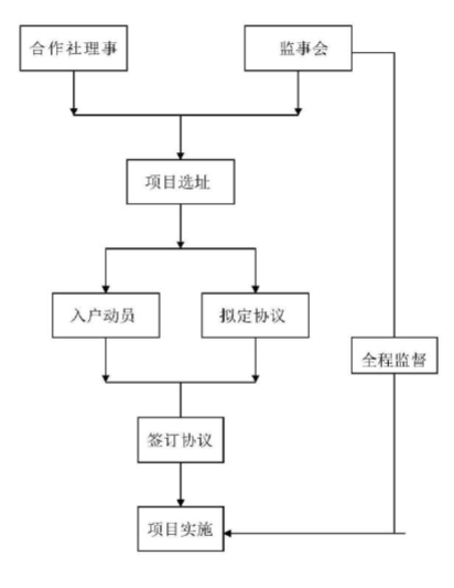 2014年以来,在全面监督的大环境下,塘约村通过党组织、村委会、合作社“三套马车”并架齐驱,探索“村社一体、合股联营”发展模式、“3+X”信贷模式等做法,推动农村产权制度改革、农业经营制度改革及村级制度改革,推进了合作社运行制度化、农村资源价值化、农民身份股东化、村民收益多元化、农业产业现代化、人与自然和谐化“六步同化”。塘约村合作社首先由合作理事会和监事会以及村支两委进行项目选址,然后由现有合作社的七个基地进行工作,理事会和监事会相互监督。