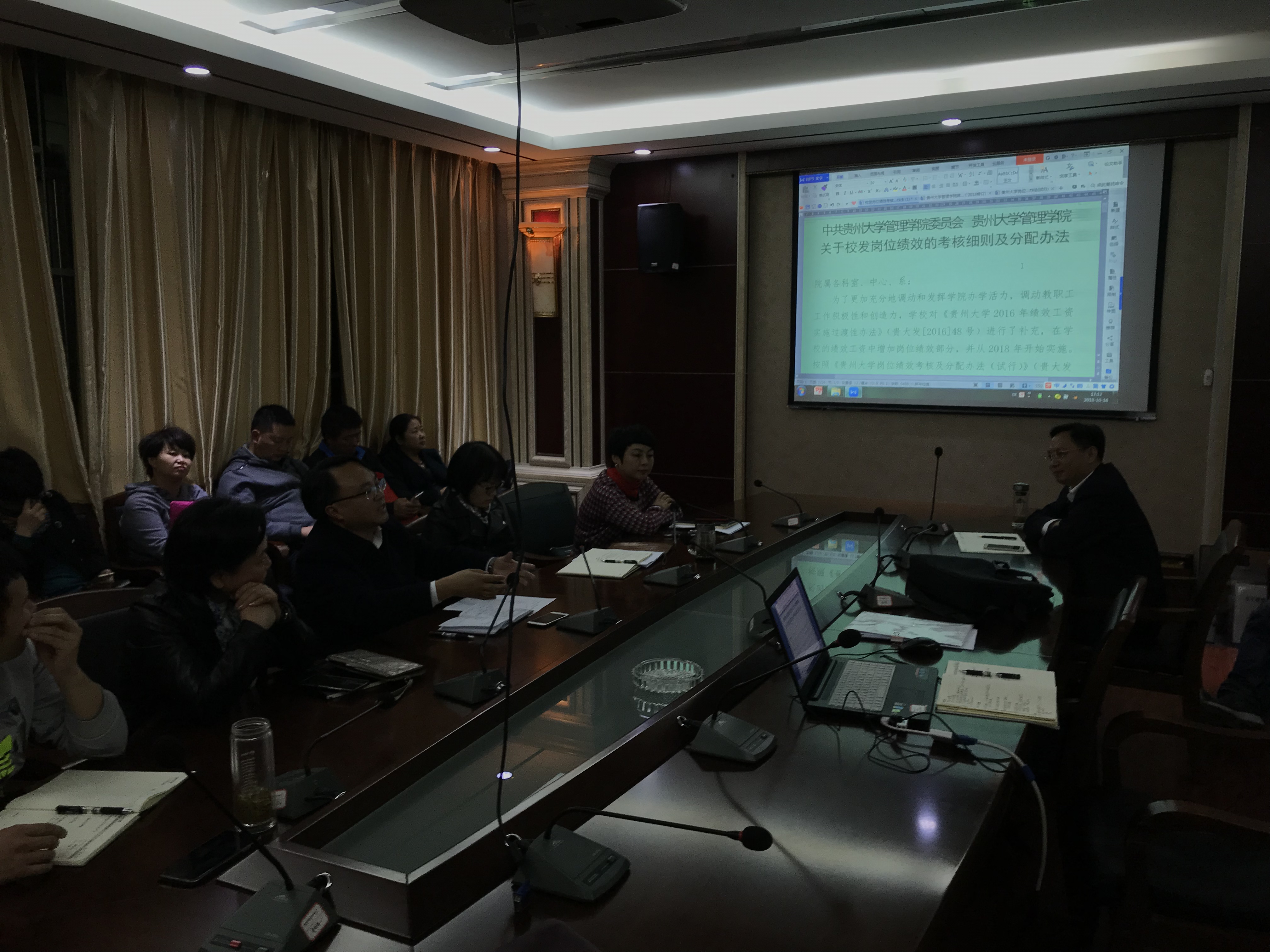 其次,李院长传达了《贵州大学岗位绩效考核及分配办法(试行)》(贵大发2018175号)的文件精神,指出学院须对绩效考核及分配办法进行修订和完善,补充制定岗位绩效部分的考核及分配办法,进行岗位绩效的考核及分配。学院本着效率优先、兼顾公平的原则,拟定了考核细则及分配办法(初稿)。