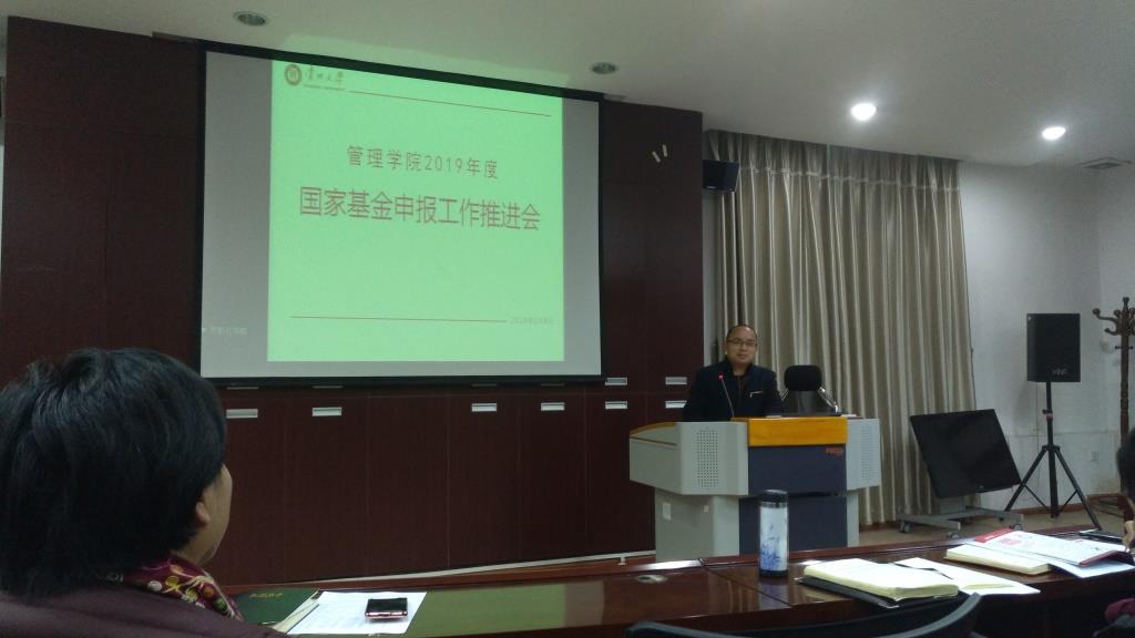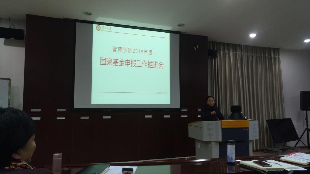 为了落实贵州大学对管理学院下达的2019年申请国家社科基金项目的任务和为完成2019年管理学院的科研目标考核做好准备,我院于201918日下午3:00在管理学院1101室召开“管理学院2019年度国家基金申报工作推进会”。管理学院所有今年没有国家级在研项目的教授、副教授和具有博士学位的教师参加了此次会议,李烨院长主持本次会议。会议分为以下几个议题进行:1、传达学校关于国家社科基金申报工作推进会的会议精神;2、进行2019年度国家项目申报工作部署;3、邀请本院获得国家社科基金立项的教师分享申报经验。
