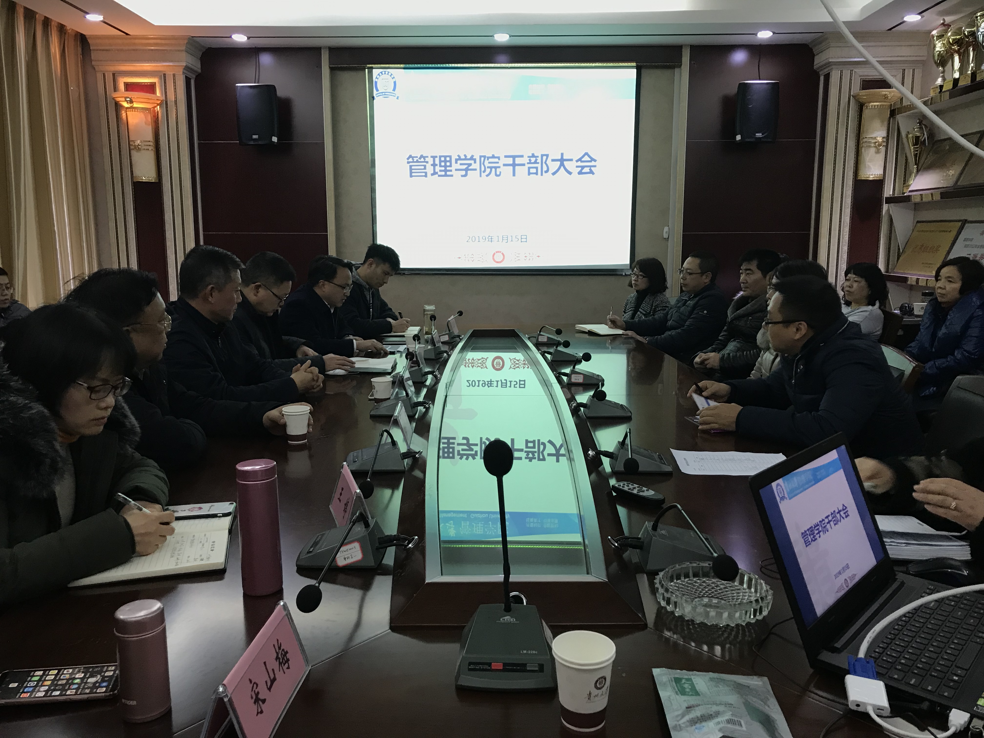 根据学校党委的安排,2019年1月15日上午11:00,学院在103会议室召开干部大会,学校常务副校长王红蕾教授、学校党委组织部李昕昌部长、管理学院新任党委书记王秀峰教授出席会议,学院党政领导班子、各科室(中心)负责人、系主任、系党支部书记等中层干部参加会议,会议由学院院长李烨教授主持。