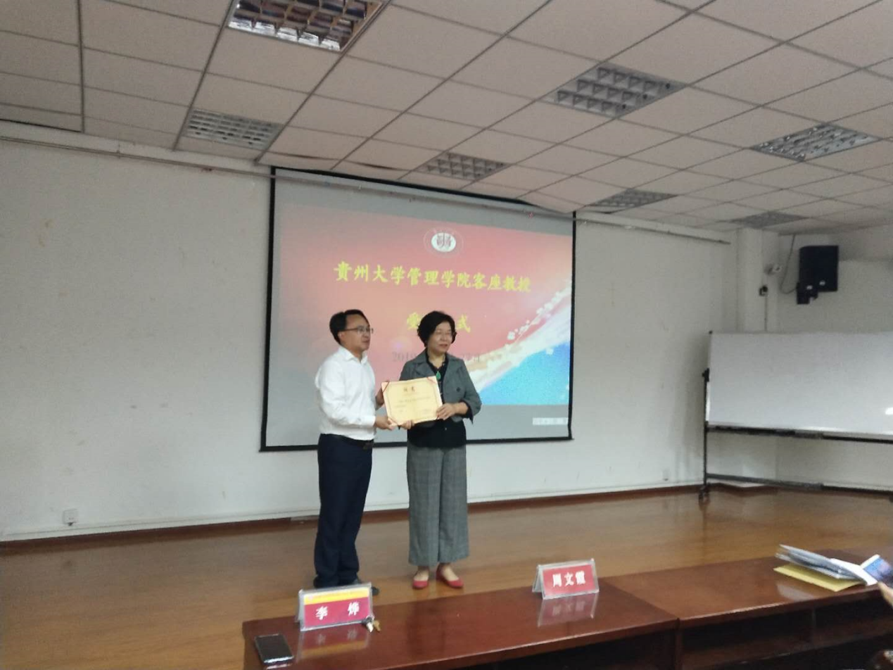 讲座由乐动官方网站副院长周莉莉教授主持,全体MBA研究生参会,并由李烨院长为周文霞教授颁发贵州大学客座教授聘书。