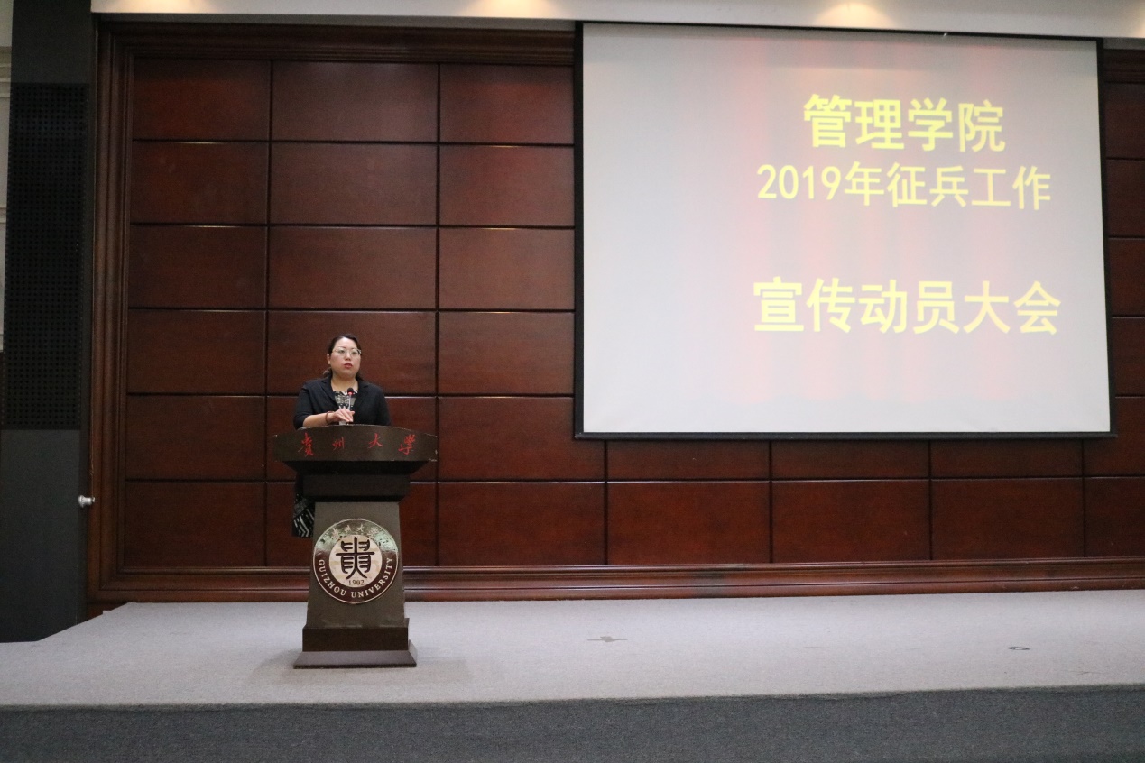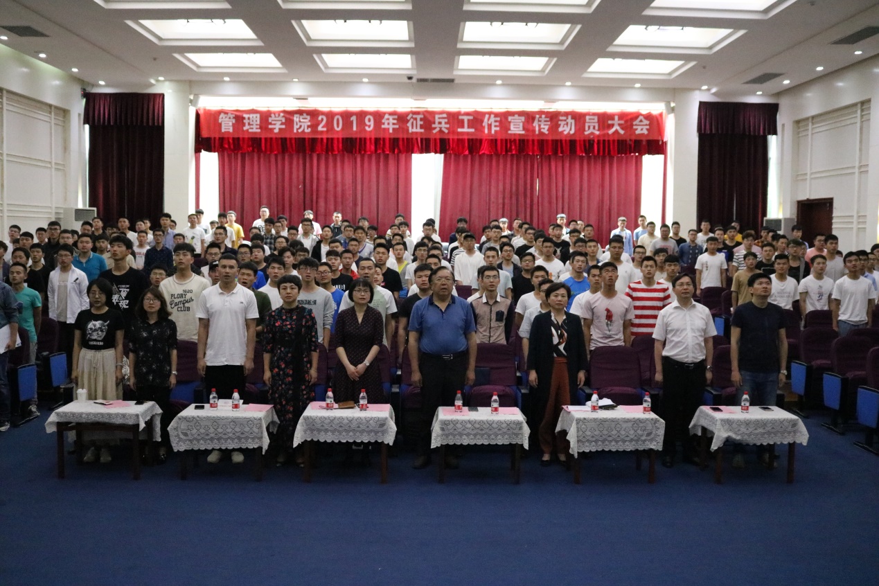 为进一步贯彻落实贵州省普通高等学校征兵工作的要求,号召学院学生积极响应国家号召,携笔从戎,献身国防,报效祖国。管理学院于5月17日中午12:40分在北校区一号行政楼报告厅组织召开管理学院2019年征兵工作宣传动员大会。学院党委书记王秀峰教授;管理学院副院长王婷教授、周莉莉教授、宋山梅教授;党委副书记张亚军老师;党政办公室、教学科研科、学生科、各系主任、学院2016和2017级全体男生参加大会,大会由学生科科长芮丽华老师主持。