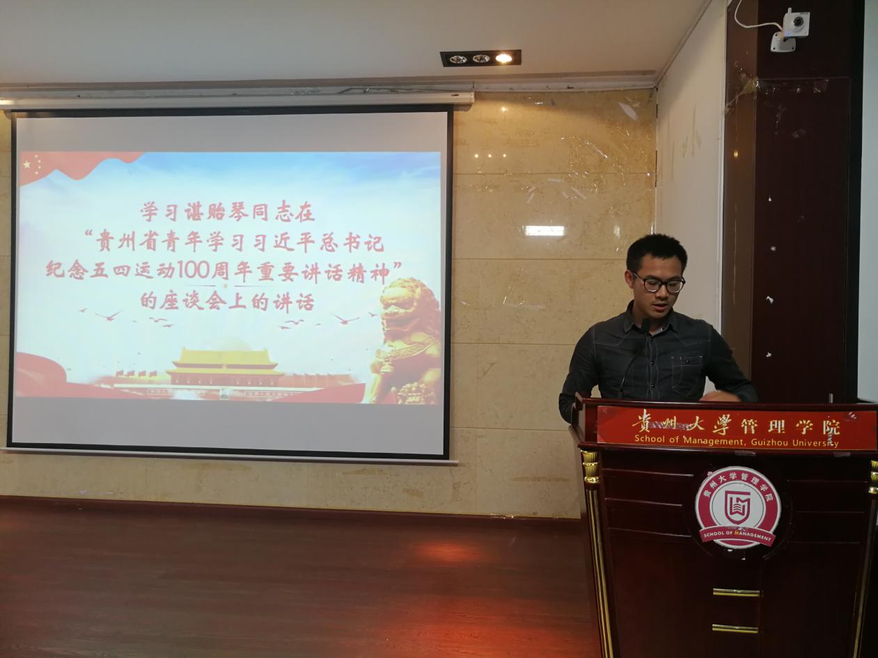 5月9日20点整,在管理学院三楼报告厅举行了学习谌贻琴同志在“贵州省青年学习习近平总书记纪念五四运动100周年重要讲话精神”的座谈会上讲话的活动。管理学院第九期发展对象培训班全体学员参加此次活动,本次学习活动由王馨悦同学主持。