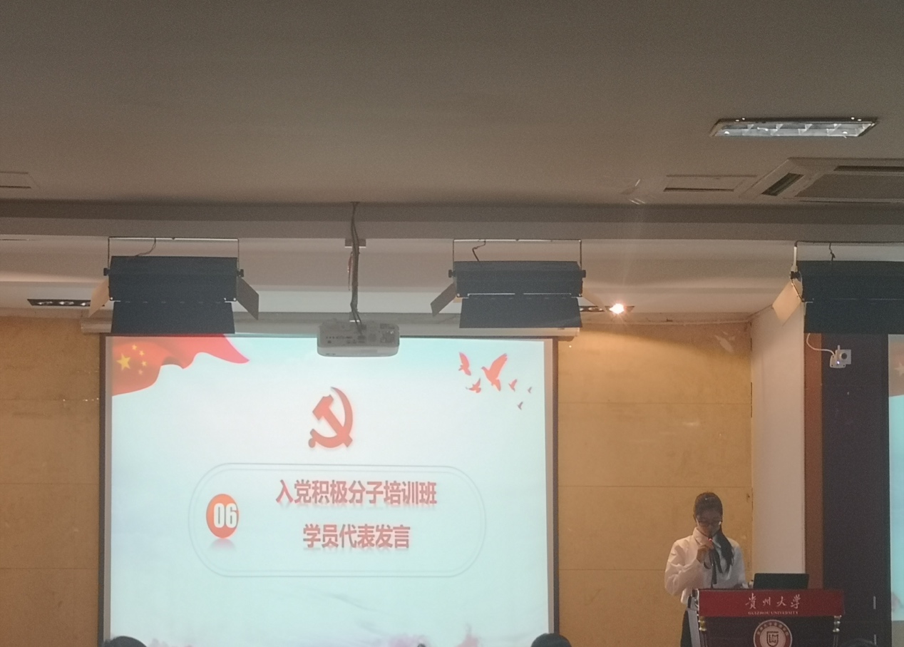 在介绍完培训班联络方式之后,入党积极分子培训班学员代表袁虹琳同学和发展对象培训班学员代表陈雨同学分别发言,两位同学表示入党积极分子和发展对象都要以一名党员的标准严格要求自己,努力学习,言行一致,加强自身思想建设,主动承担社会历史责任,成为学生的榜样。