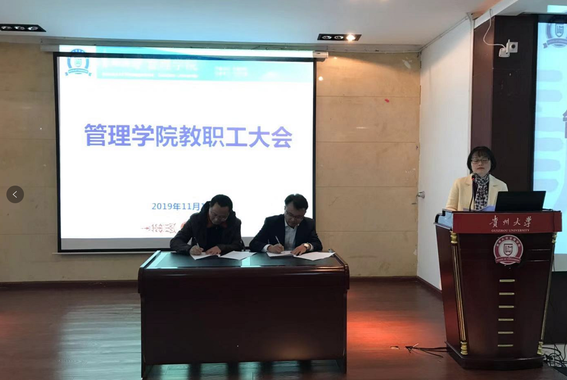 接着,会上进行管理学院2020年国家级项目申报考核目标责任书的签约仪式,由王婷副院长主持。她介绍目前学院开展国家级课题申报的情况,指出目的是为了促进学院2020年国家级课题申报工作的顺利进行,确保能完成学校下达的考核工作任务。管理科学与工程系、营销与电商系、工商管理系和会计系的系主任分别上台与李烨院长签订责任书。