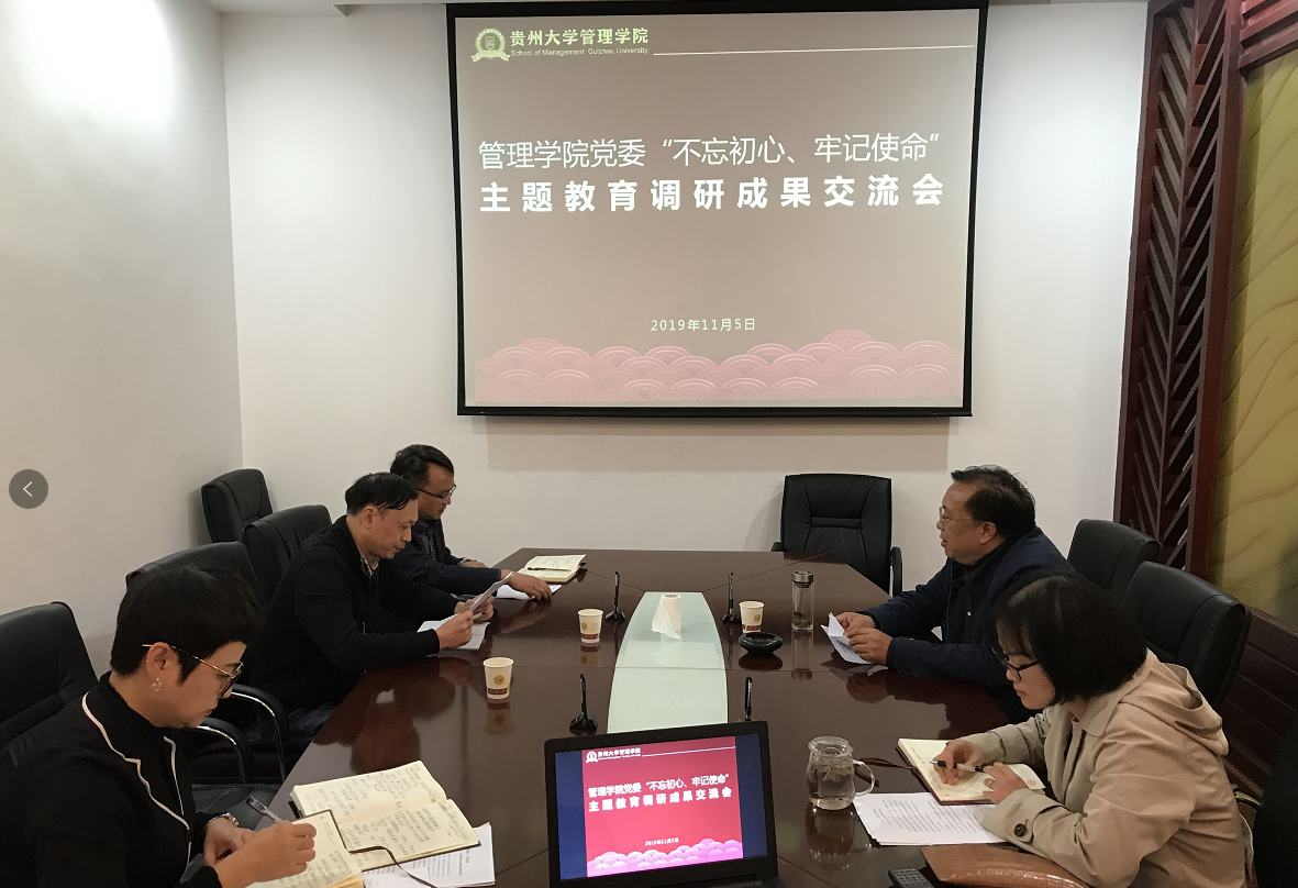 11月5日下午16:00,管理学院“不忘初心、牢记使命”主题教育调研成果交流会在三楼陈列室举行。学校主题教育工作第三巡回指导组副组长毛元华,学院党委领导班子成员参加会议,会议由学院党委书记王秀峰主持。