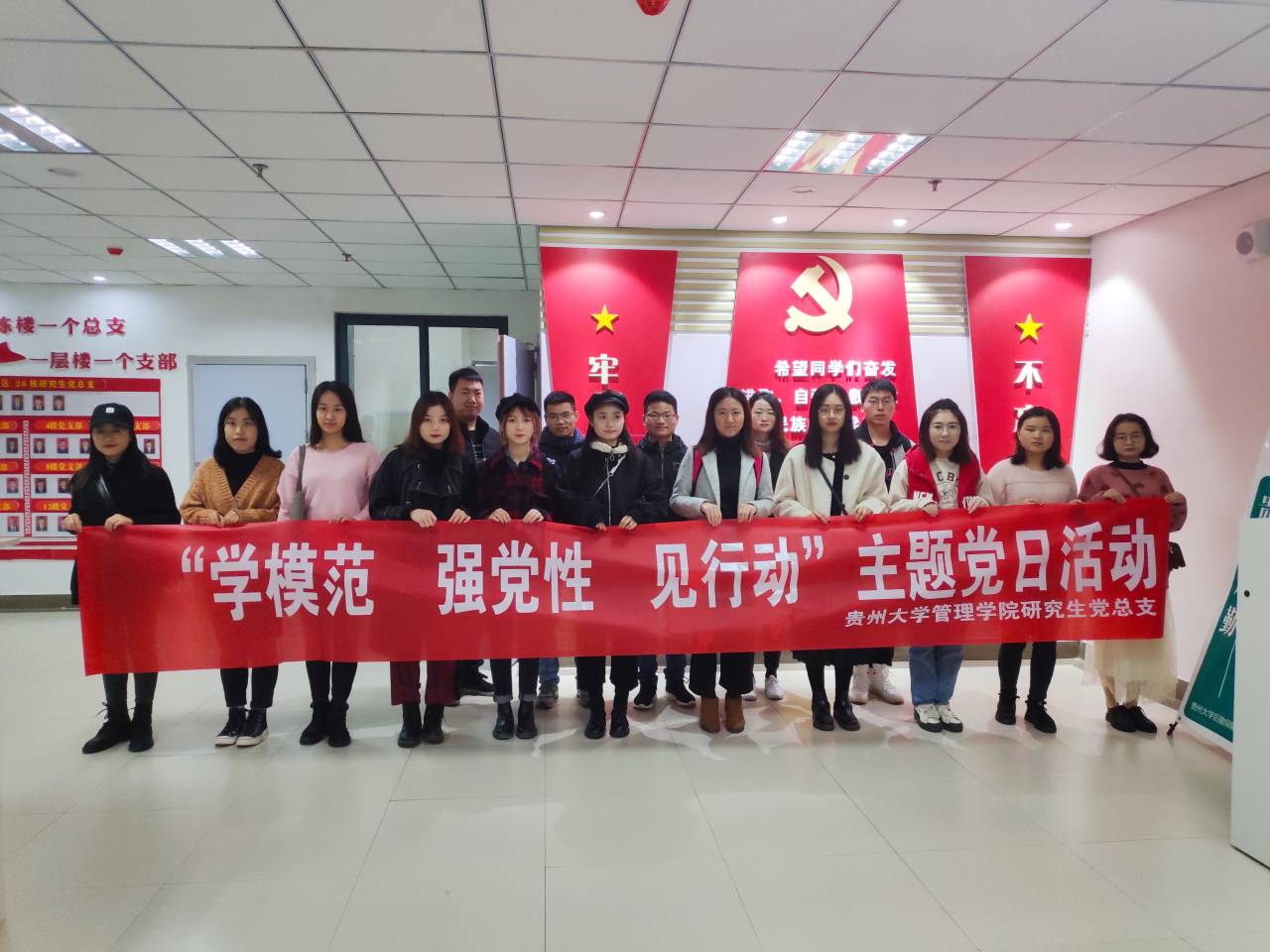 为进一步增强党总支的凝聚力,完善党组织建设,加强对模范党总支的学习,11月24日上午,管理学院研究生党总支组织了“学模范 强党性 见行动”的主题党日活动,带领管理学院2019级全体研究生党员及2018级、2017级研究生党员代表,一行16人,参观了贵州大学26栋特色党支部示范区。