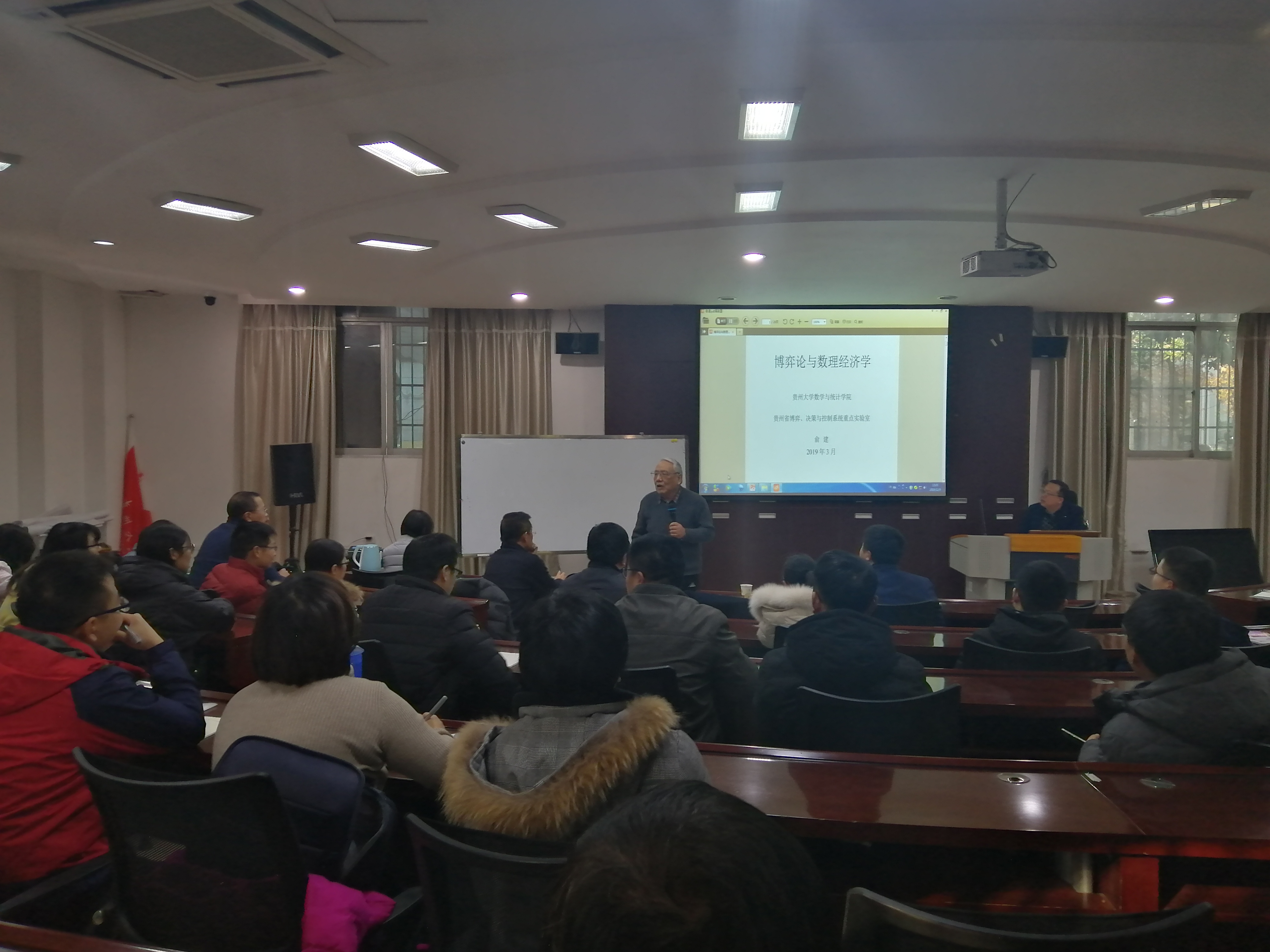 12月9日下午15:00,贵州大学数学与统计学院俞建教授莅临乐动官方网站,在管理学院一楼圆形教室报告厅做了题为“博弈论与数理经济学”的专题讲座。讲座由管理学院副院长王婷主持,管院部分教师及2018级全体研究生到场聆听。