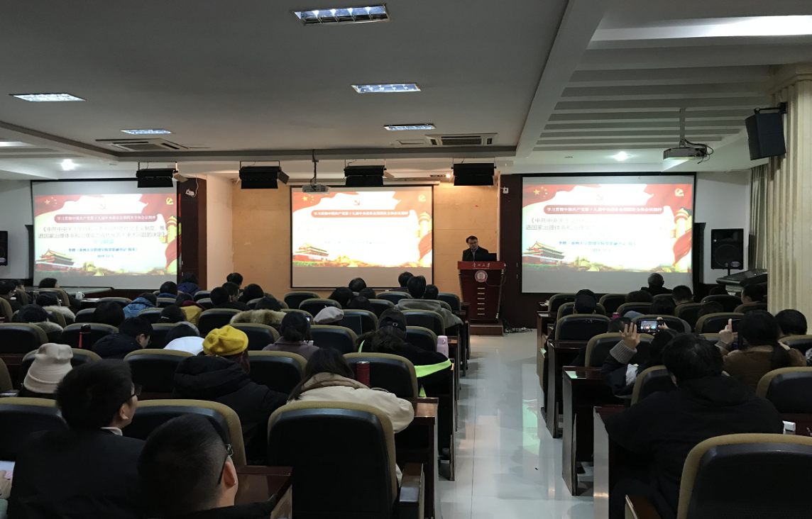 会上,李烨院长按照《学习贯彻中国共产党第十九届中央委员会第四次全体会议精神》要求,对《决定》的起草背景、内容和意义进行详细解读。关于《决定》的具体内容,李烨院长首先就《决定》的整体框架为大家做了说明,即15部分3大板块;接着,李烨院长为大家详解了决定的1个重要判断、13个坚持和1个总体目标、13个坚持和完善的未来部署。