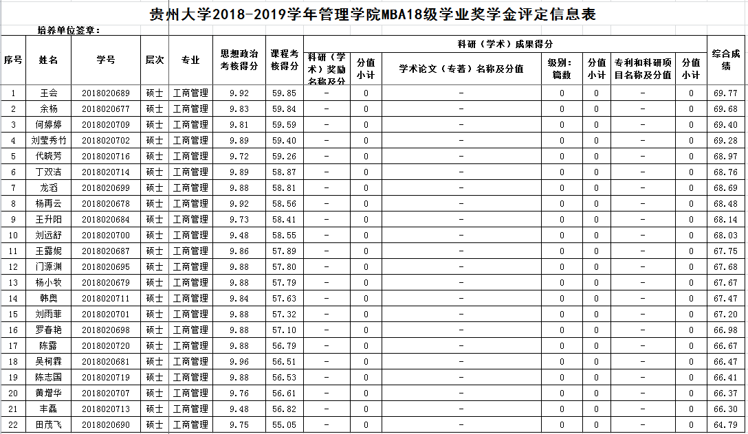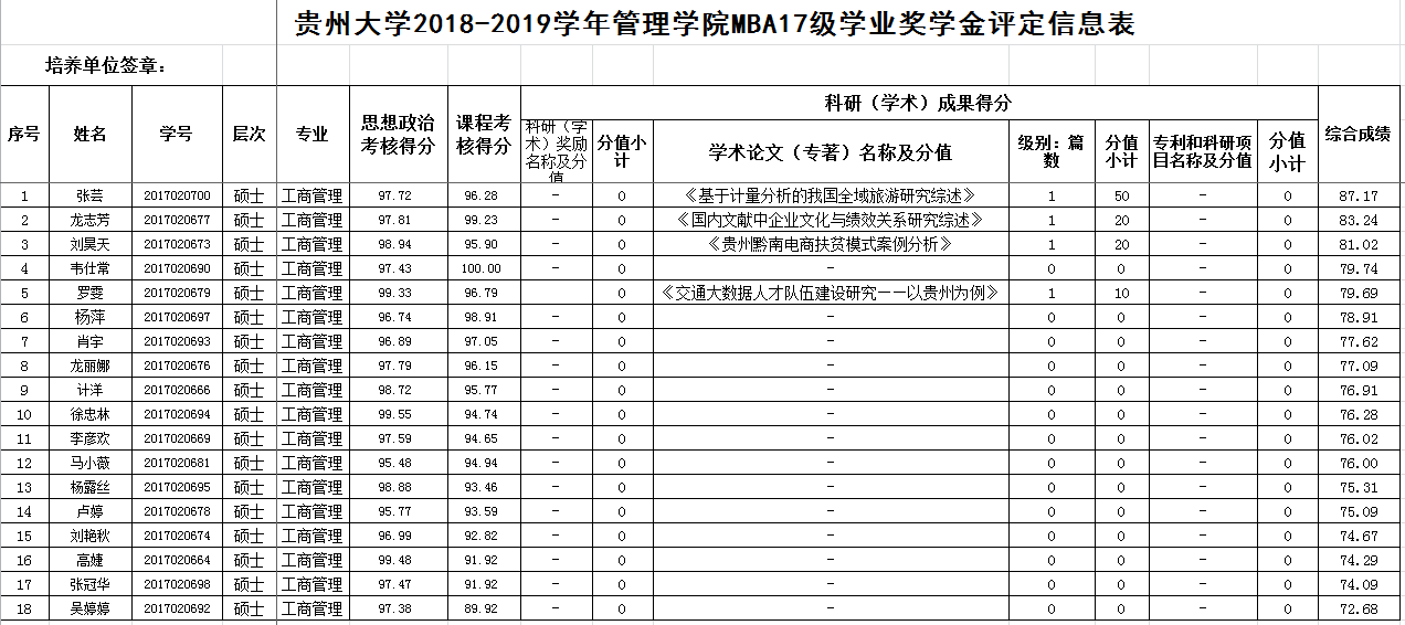 贵州大学2018-2019学年管理学院MBA17级、18级学业奖学金评定信息
