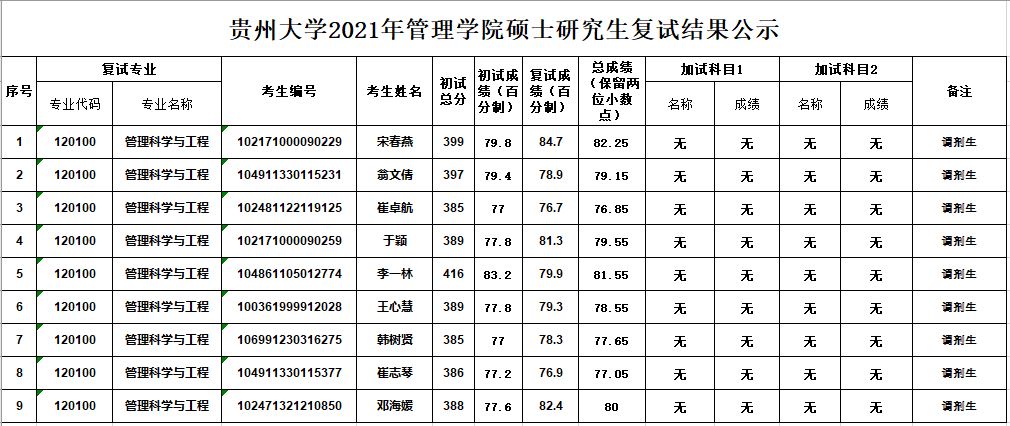 贵州大学2021年管理学院硕士研究生复试结果公示