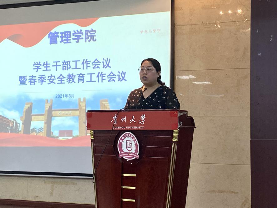 在清明假期即将到来之际,为了加强学生安全意识,提高我院班级和学生组织的工作能。2021年3月29日中午13:00,管理学院在三楼报告厅召开学生干部工作会议暨春季安全教育工作会议。出席本次会议的老师有院党委副书记洪影秋老师、学生科科长芮丽华老师、团委负责人陈芊羽老师、学生科辅导员向珂莹老师、车婧娴老师、陈黔江老师以及各班级、各学生组织的学生干部。会议由芮丽华老师主持。