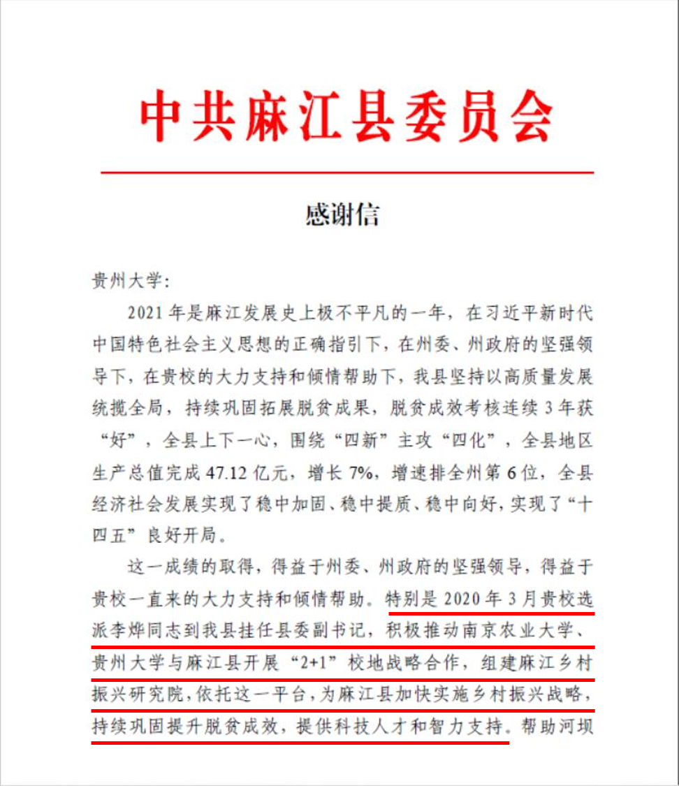信中特别指出,我院院长李烨在挂任麻江县委副书记期间,积极推动南京农业大学、贵州大学与麻江县开展“2+1”校地战略合作,组建麻江乡村振兴研究院,依托这一平台,为麻江县加快实施乡村振兴战略,持续巩固提升脱贫成效,提供科技人才和智力支持。同时,在帮助申报少数民族传统村落示范村、省级和州级特色田园乡村·乡村振兴集成示范试点,培训各类人员,外资引进和发展教育等方面贵州大学都做了大量卓有成效的工作。