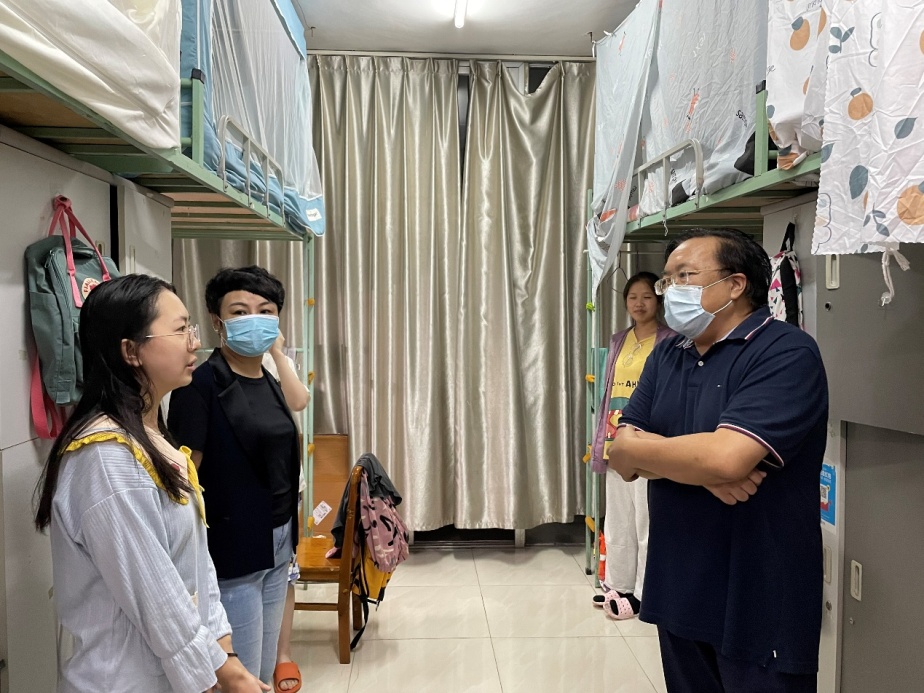期间,王秀峰、周莉莉一行与同学们充分交流,亲切地问到今天学校准备的免费晚餐是否可口,同学们对学校中秋节准备的特别晚餐也都给出了好评。当来到管理学院研究生新生宿舍,王秀峰还询问了研究生新生对于特殊时期在学校的学习生活是否能够适应、对于学校各方面的安排是否满意,研究生同学们表示适应良好,对于学校各方面的安排都比较满意。