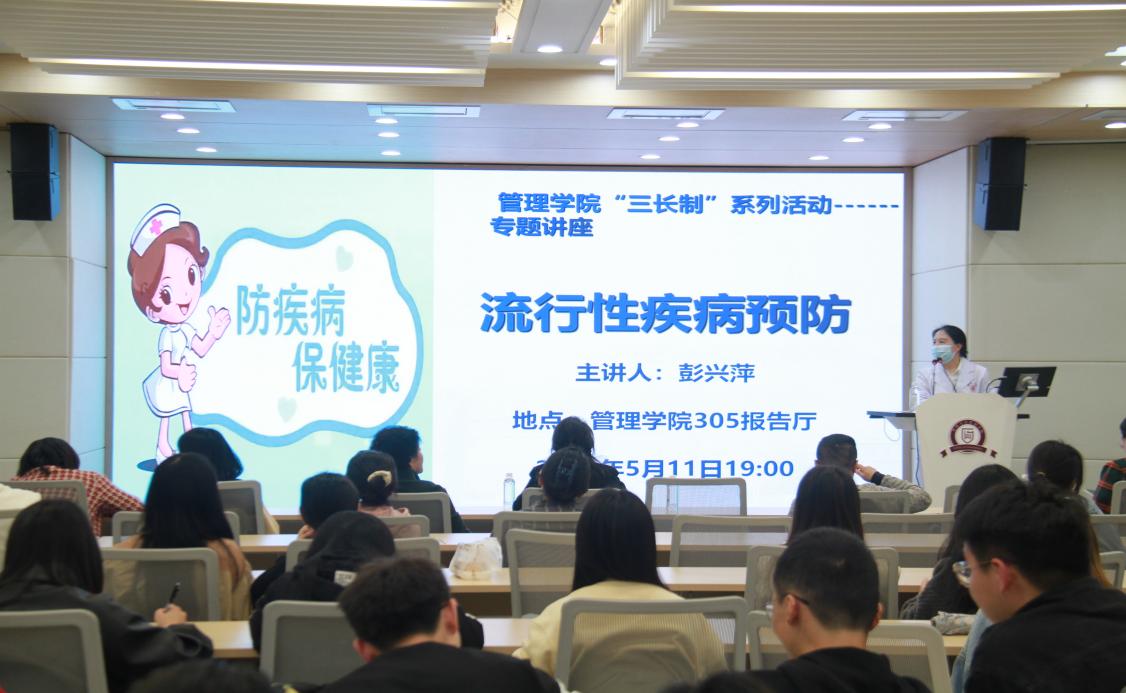 2023年5月11日晚上7点,管理学院“三长制”系列活动——“流行性疾病预防”专题讲座在管理学院三楼报告厅举行。讲座由校医院彭兴萍医生主讲,管理学院党委副书记邓琳、管理学院关心下一代委员会常务副主任李景勃老师、学生科辅导员出席讲座,本次会议由学生科科长芮丽华主持。