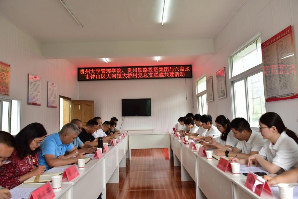 为庆祝中国共产党成立102周年,学习贯彻落实党的二十大精神,把学习贯彻习近平新时代中国特色社会主义思想主题教育走深、走实,2023719日,贵州大学党委正处级组织员、管理学院党委副书记(主持党委工作)周莉莉、管理学院党委副书记邓琳、管理科学与工程系教工党支部书记陈刚、研究生第二党支部书记龚潇潇以及支部党员代表等一行11人同贵州铁路投资集团董事会秘书和党委组织部(人力资源部)主任余松、贵州铁路投资集团安六(叙毕)公司党委书记、董事长李万波等6人共赴六盘水市钟山区大河镇大桥村和大湾镇腊寨村分别开展党支部联建共建活动,旨在通过高校、企业和乡村三方进行党建联建,实现高校、企业党组织与农村基层组织的深度融合,充分发挥高校在乡村振兴中的作用,提升乡村党建工作的质量和水平,推动农村经济社会发展全面进步。