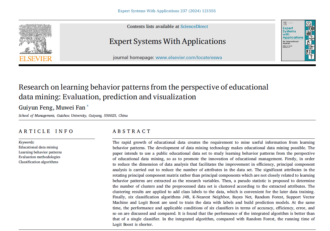 乐动官方网站管理科学与工程系硕士研究生冯桂云,教师范慕炜博士(通讯作者)在Expert Systems with Applications期刊(中科院一区顶刊,IF:8.5)发表文章《Research on learning behavior patterns from the perspective of educational data mining: Evaluation, prediction and visualization》。
