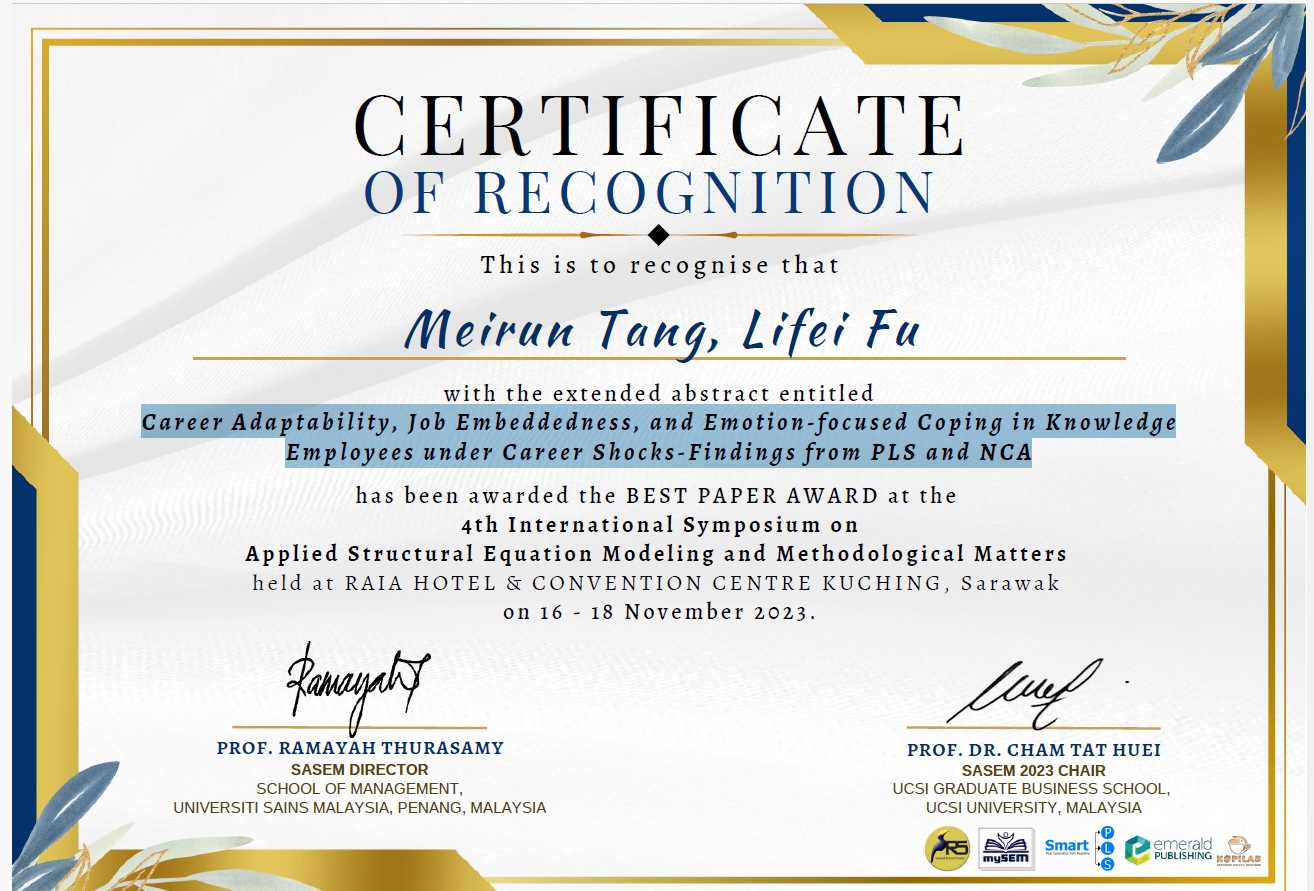 此次研讨会还邀请了Emerald出版社组织的编辑,讨论了如何在高水平期刊上发表论文;同时,来自全球各国的教授、学者和博士生们也纷纷汇报了自己近期的研究成果。可喜的是,汤美润老师及其研究生付礼菲(2022级工商管理专业)合作的论文“Career Adaptability, Job Embeddedness, and Emotion-focused Coping in Knowledge Employees under Career Shocks—Findings from PLS and NCA”深受评委会青睐,赢得了最佳论文奖项。此次成就标志着乐动官方网站在国际学术界的影响力进一步提升,同时也为研究生培养提供了国际化的视野和实践平台。