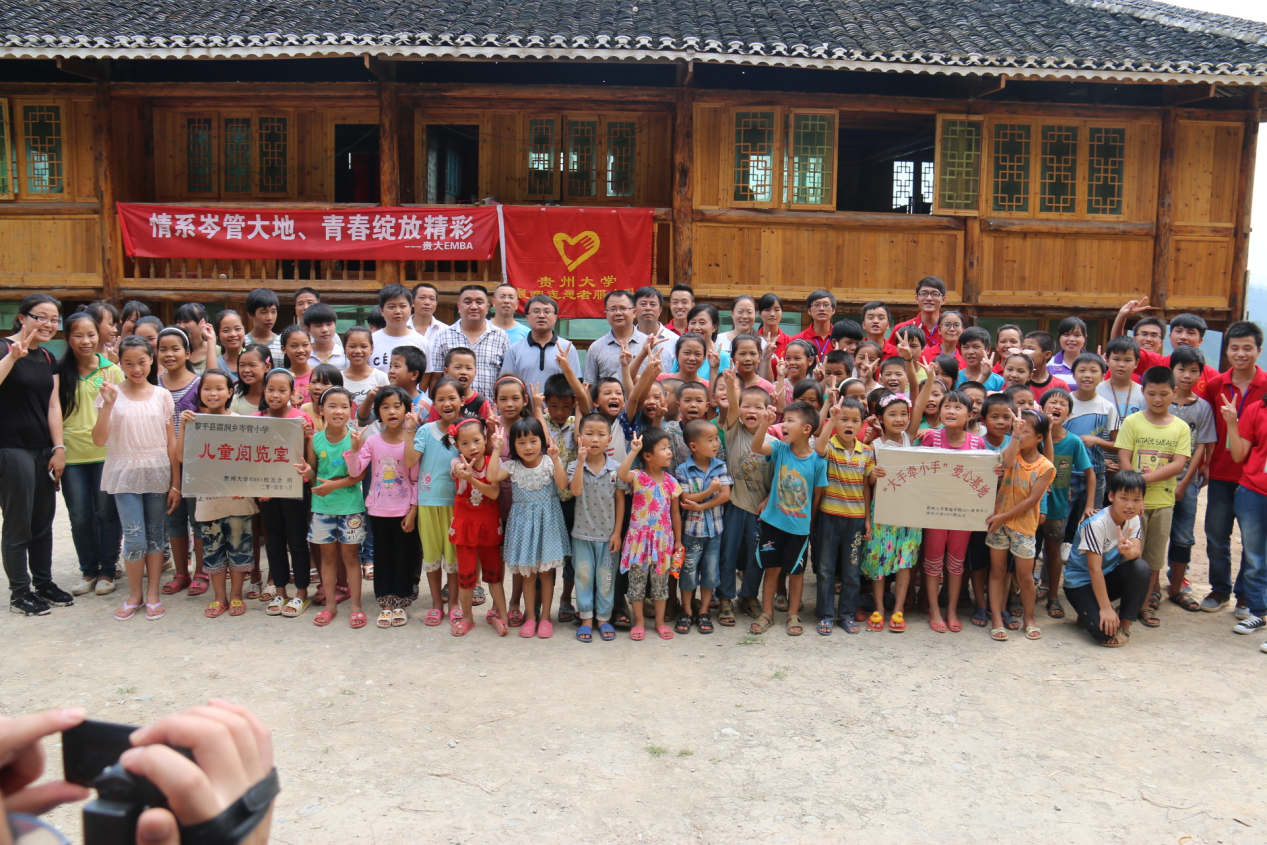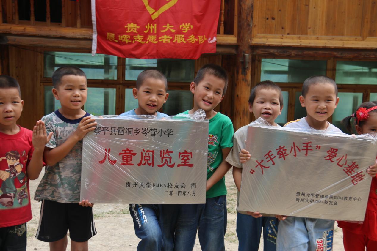 EMBA中心/EMBA校友会得知雷洞乡岑管小学校舍老化,他们的文体、学习用品存在短缺EMBA中心/EMBA校友会与岑管小学积极联系。随后开展了一系列的公益助学活动,从2013年一直坚持,让该爱心活动得以延续,2014年8月“大手牵小手”爱心基地正式挂牌。