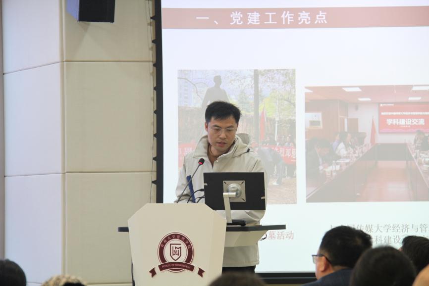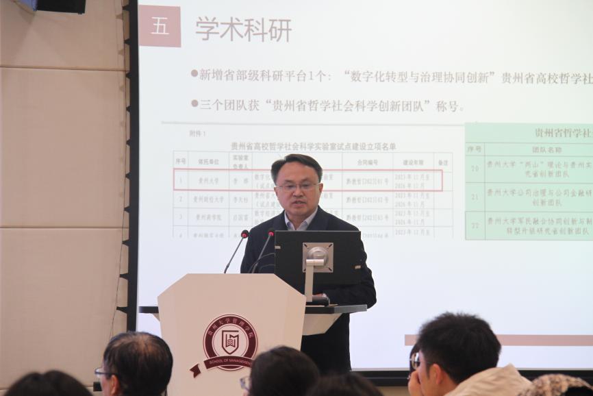 李烨院长通报总结2023年度管理学院推进的主要工作和取得的成效,表扬并肯定全体教职工2023年度的工作成果,同时也指出部分不足之处,鼓励学院全体教职工继续奋斗,在新的一年里再接再厉,有所突破。