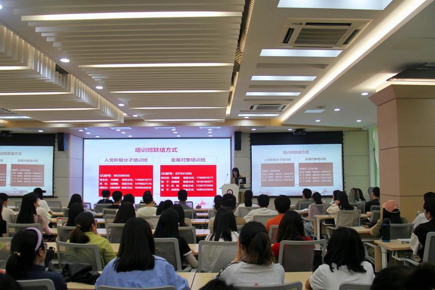 典礼第三项,介绍培训班联络方式。车婧娴老师对入党积极分子培训班和发展对象培训班的QQ群号、班主任以及相关班级学生负责人进行介绍,便于大家尽快熟悉负责人,确保后期学习和交流地顺畅进行。