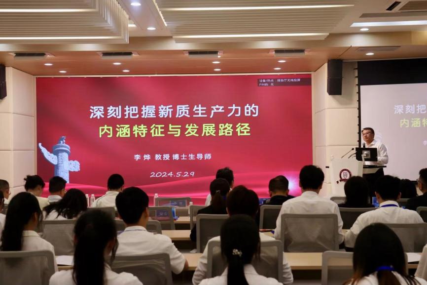 在创新创业论坛环节,第一项议程是管理学院院长李烨教授进行主题为“深刻把握新质生产力的内涵特征与发展路径”的演讲,深入全面地阐述了什么是新质生产力,为什么要加快形成新质生产力以及如何培育和发展新质生产力,系统阐释了是什么、为什么、怎么做三个重要命题,为管理学院如何正确理解把握发展新质生产力提供了新思路、新理念、新方法和新启发。最后,李烨院长强调新质生产力的形成并非一蹴而就,而是一个需要逐步推进的系统过程。在这一过程中,必须根据具体情况因地制宜,充分发挥自身优势,才能有效推动新质生产力的发展。