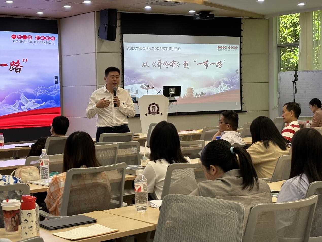 2024年7月6日,贵州大学管理学(EMBA&MBA&EDP)菁英读书会在管理学院三楼报告厅举办了主题为从《哥伦布》到“一带一路”的读书活动。本期读书由EMBA校友罗纲举(贵阳方舟科技有限公司总经理、读书会荣誉会长)分享。活动以现场分享、互动提问的方式让来自读书会和学院在读的MBA约40多名校友、同学参与到本次活动当中。贵州大学党委委员、乐动官方网站院长李烨出席了活动。活动主持人为读书会会长吴迪、读书会联合会长陈隽宁。