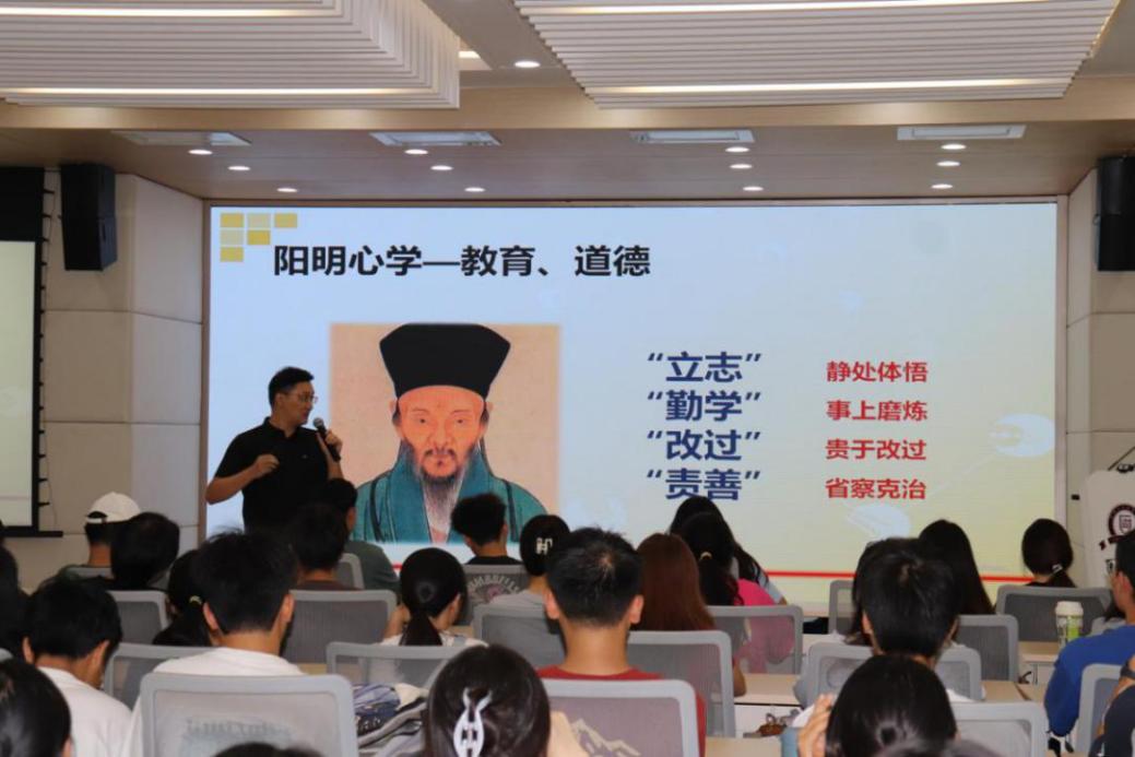结合同学们对外语学习的看法,沈麟教授首先以“贵州大学杰出校友龙永图回访母校”为例,告诉同学们外语学习对我们生活和事业有着重要的影响,激励同学们积极学习外语,努力学好外语。随后沈麟教授指出“阳明心学”中强调“立志”“勤学”“改过”“责善”,告诉同学们在外语学习的过程中要“静处体悟”“事上磨炼”“贵于改过”“省察克治”。
