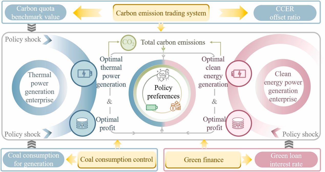 作为减排的关键参与者,发电企业在多维政策中的生产决策对其减排和发展至关重要。因此,本研究构建了一个基于Stackelberg的政策影响下发电企业生产决策模型,考虑了碳排放权交易、煤炭消费控制和绿色金融三种政策,以确定发电企业的发展战略和政策偏好。本研究旨在阐明多维政策对发电企业生产决策的影响,从而获得同时考虑减排和企业发展的政策设计解决方案。(研究框架如下图所示)。