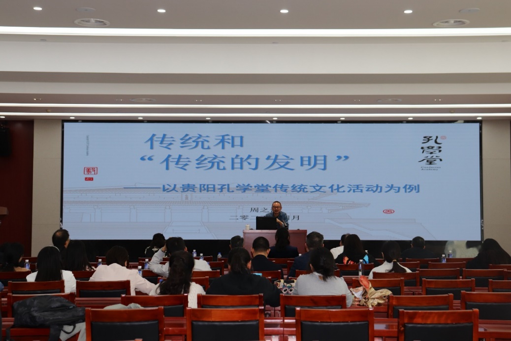 孔学堂文化传播中心副主任周之江题为《传统和“传统的发明”——以贵阳孔学堂传统文化活动为例》的讲座。他深入讲解了孔学堂建设和历史,作为贵州省高端文化学术交流平台与传习研修基地,以深厚文化底蕴与丰富活动资源,为优秀传统文化与专业实践融合提供优质载体期望与贵州高校一道共同讲好贵州故事,传播好贵州声音,提升国家文化软实力和中华文化影响力。