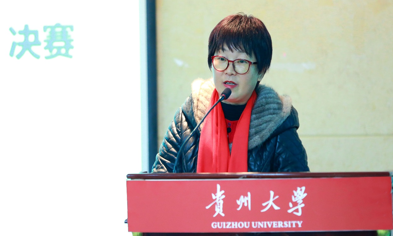 贵州大学党委令狐彩桃副书记致辞。她希望各参赛队伍能够以本次比赛为契机,持续对接麻江县当地,针对自己感兴趣的农产品探索营销新模式,创造性地发掘农产品的价值,将自己的项目坚持下去,创造出消费者买到好东西、扶贫产品卖出好价钱、贫困群众增收闯出好路子的多赢局面,酿造出增加扶贫产品品牌价值、激发扶贫产品市场活力的良性社会效应,展现出贵大学子敢为人先、忧国忧民的家国情怀和在响应“乡村振兴”战略中的担当作为。