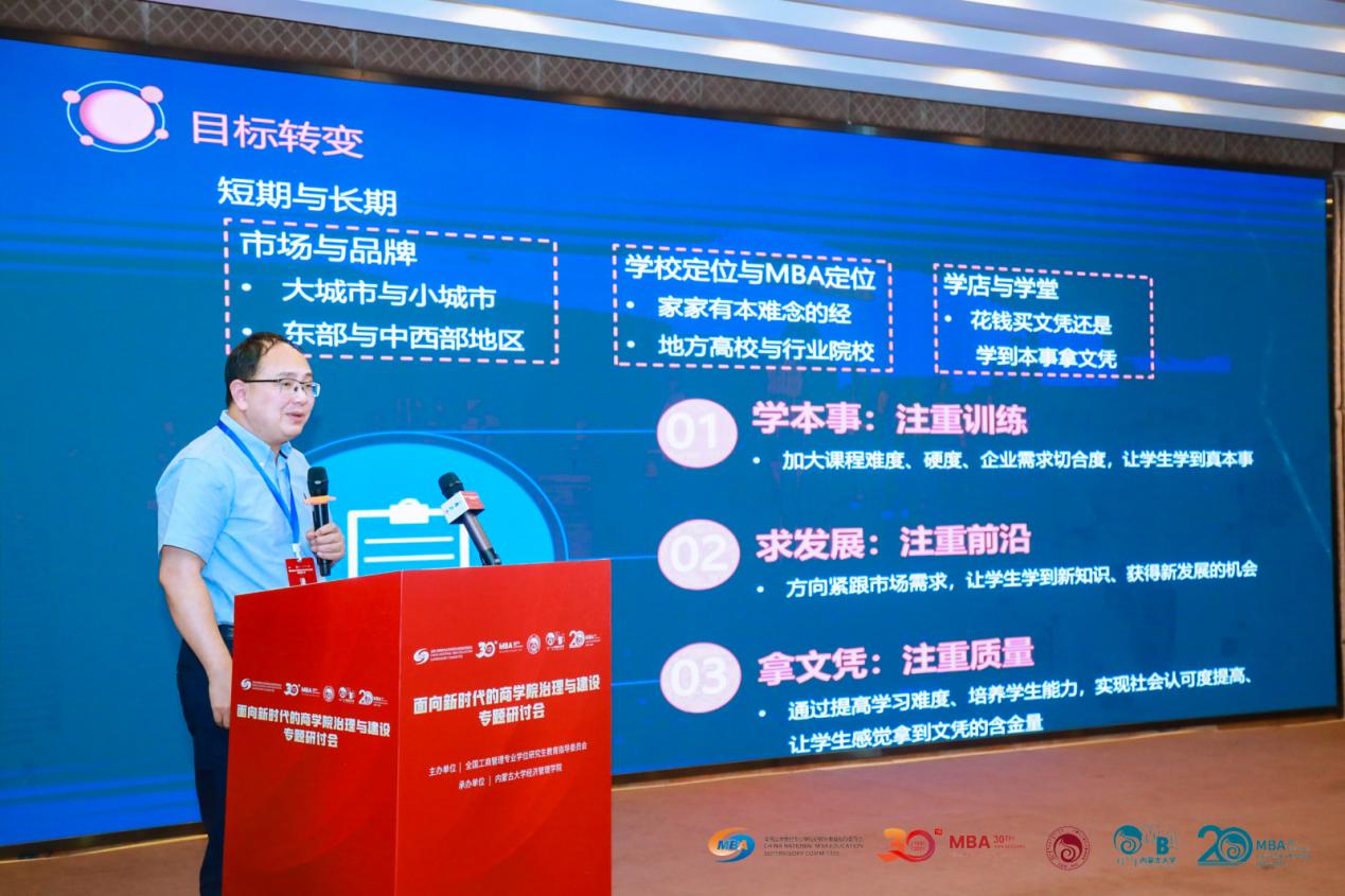 2021年7月29日,由全国工商管理专业学位研究生教育指导委员会(以下简称“全国MBA教指委”)主办,内蒙古大学经济管理学院承办的“面向新时代的商学院治理与建设”专题研讨会在呼和浩特市成功举办。乐动官方网站副院长周莉莉教授和MBA教育中心副主任何跃勇老师参加了此次研讨会。
